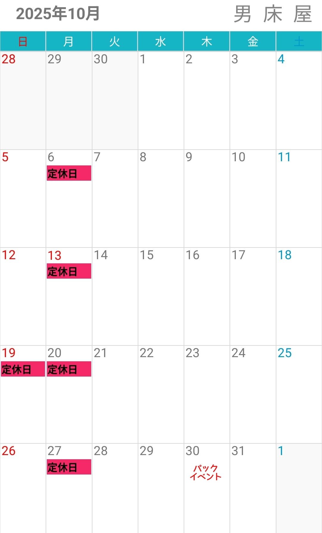 10月の定休日は毎週月曜・第三週日曜日とさせていただきます。